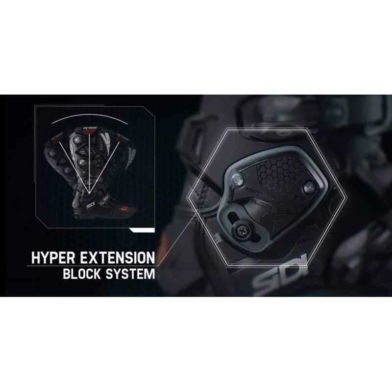 The Crossfire 3 is, as in the previous version, equipped with 2 joints: the first lower joint on the ankle, called “hyper extension block”, has a brand new technology. It prevents hyper extension of the ankle, of the instep and of the back tendon during front and back leg flexure. Such technology gives more safety to the rider.