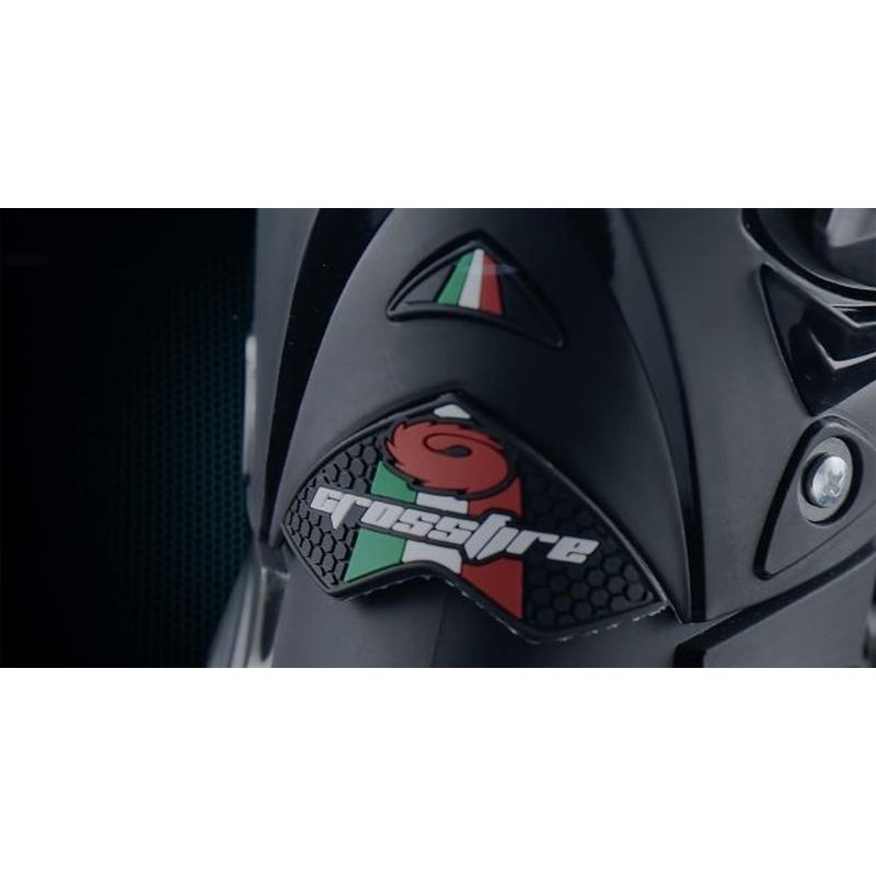 This regulation has been increased for better performance. The front shin plate is anatomically shaped and replaceable. Crossfire 3 uses a 4 micro adjustable buckle closure, each with locking teeth and micrometric memory-regulation straps. Buckles, straps and retaining clips are easily replaceable. Buckles have just one fixing point (by a screw) and this allows an easy closure and the buckles to adapt to the rider’s position.