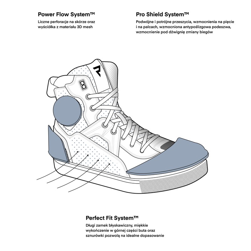 Buty motocyklowe Rebelhorn Vandal zostały uszyte ze skóry bydlęcej. Dobrą wentylację zapewniają perforowane panele i podszewka 3D mesh. Buty mają wzmocnioną podeszwę, twarde osłony pięt i kostek. Długi zamek z boku ułatwia ich zakładanie. Kolorystyka butów motocyklowych Vandal nawiązuje do kurtek Rebelhorn o tej samej nazwie.