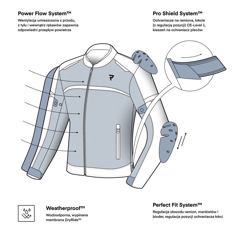 Wentylacja umieszczona z przodu, z tyłu oraz na wewnętrznej części rękawów gwarantuje odpowiedni przepływ powietrza i komfort termiczny podczas cieplejszych dni.