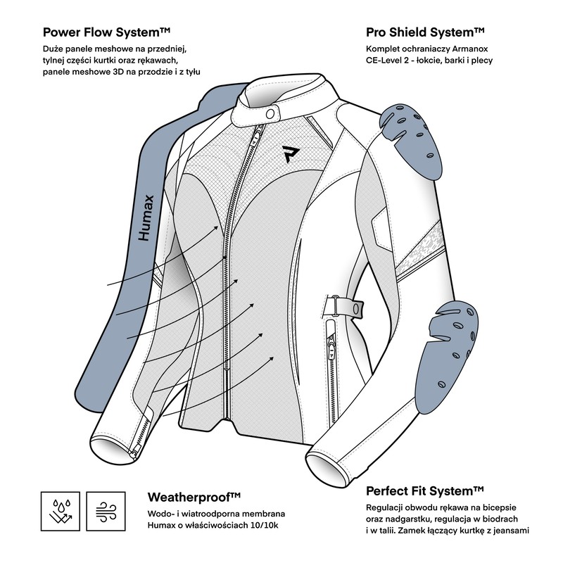 Kurtka JAX LADY jest wyposażona w zestaw ochraniaczy Armanox CE-level 2, w tym ochraniacz pleców. Spełnia wymogi drugiego poziomu ochrony, który obejmuje całą kurtkę (AA).