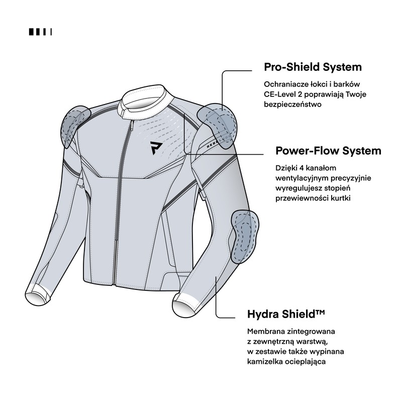 Miejska kurtka motocyklowa Rebelhorn Spark będzie Ci służyć przez cały sezon. Sprawdzi się też w krótszych trasach. Dobrze poczujesz się w niej, niezależnie czy jeździsz na nakedzie, czy na lekkim turystyku. Została uszyta z wytrzymałego poliestru 600D, ma wszytą wodoodporną membranę, a odpinana ocieplina zapewni komfort w chłodniejsze dni. Cztery kanały wentylacyjne umożliwiają z kolei regulację temperatury podczas jazdy w cieplejszym klimacie.