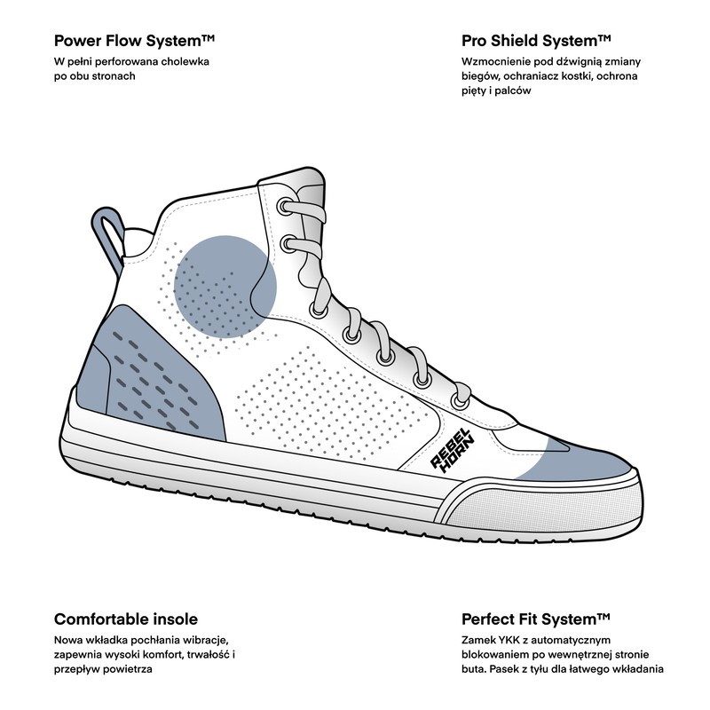 Buty motocyklowe Rebelhorn SPIKE to idealne połączenie wygody, bezpieczeństwa i stylu, zaprojektowane z myślą o codziennej jeździe po mieście. Wykonane z wysokiej jakości skóry bydlęcej o wykończeniu nubukowym, zapewniają trwałość i elegancki wygląd, który doskonale sprawdzi się w miejskich warunkach. Rebelhorn SPIKE to trampki motocyklowe, które oferują świetne dopasowanie oraz liczne cechy poprawiające komfort użytkowania, takie jak perforowane panele zapewniające doskonałą wentylację i anatomicznie wyprofilowana wkładka.