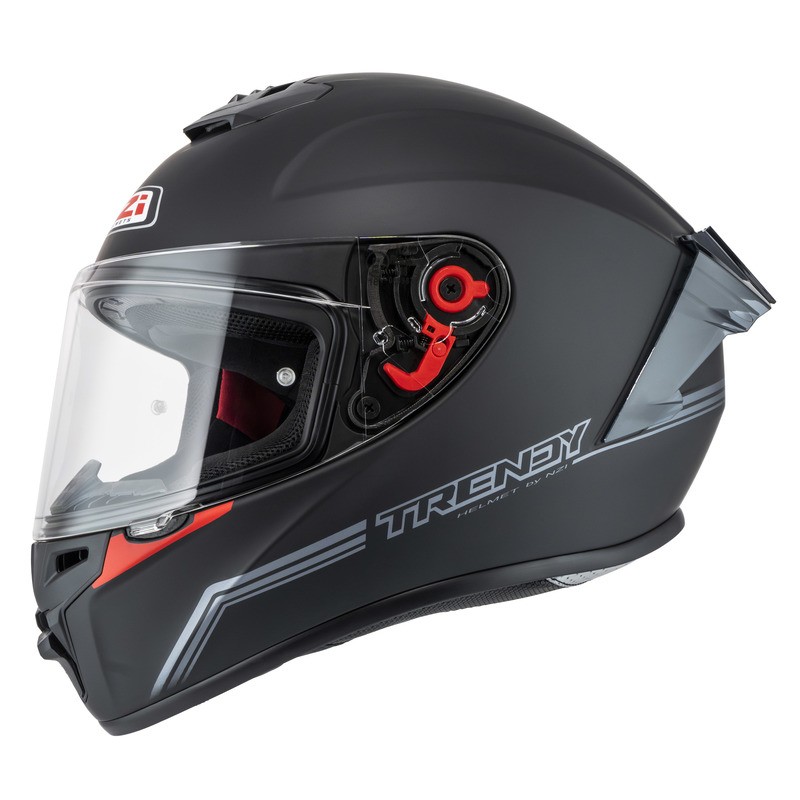 Kask motocyklowy NZI TRENDY 3 STREAM to kask integralny spełniający normę UN ECE R22.06, zaprojektowany z myślą o miejskiej jeździe i krótkich trasach. Sportowa, dynamiczna linia skorupy oraz wbudowany spoiler nadają mu agresywny wygląd i poprawiają stabilność podczas jazdy. Wizjer o wysokiej jakości optycznej zapewnia świetną widoczność, a przygotowanie pod wkładkę Pinlock pozwala łatwo zapobiegać parowaniu. To prosty, lekki i wygodny model, który dzięki nowoczesnej grafice wyróżnia się na tle innych kasków.