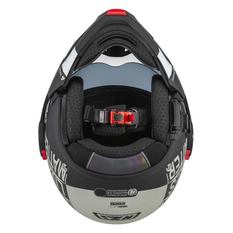 Kask motocyklowy NZI MINIMOD DUO to wyjątkowo kompaktowy kask szczękowy spełniający restrykcyjne normy UN ECE R22.06 oraz posiadający homologację P/J, zapewniając bezpieczeństwo zarówno w konfiguracji zamkniętej, jak i otwartej. Jest wyposażony w wizjer z powłoką ograniczającą parowanie oraz blendę przeciwsłoneczną. Dzięki specjalnym kanałom dla osób noszących okulary oraz wyciszającym deflektorom jazda staje się bardziej komfortowa i przyjemna. To nowoczesny, praktyczny i lekki kask idealny do jazdy miejskiej i turystycznej.