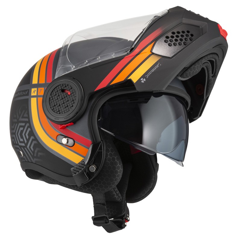 Kask motocyklowy NZI MINIMOD DUO to wyjątkowo kompaktowy kask szczękowy spełniający restrykcyjne normy UN ECE R22.06 oraz posiadający homologację P/J, zapewniając bezpieczeństwo zarówno w konfiguracji zamkniętej, jak i otwartej. Jest wyposażony w wizjer z powłoką ograniczającą parowanie oraz blendę przeciwsłoneczną. Dzięki specjalnym kanałom dla osób noszących okulary oraz wyciszającym deflektorom jazda staje się bardziej komfortowa i przyjemna. To nowoczesny, praktyczny i lekki kask idealny do jazdy miejskiej i turystycznej.