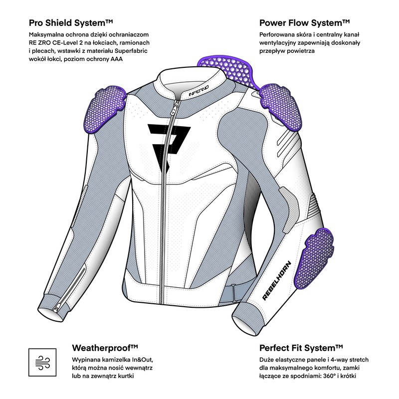Rebelhorn Inferno oferuje maksymalny poziom ochrony dzięki ochraniaczom RE ZRO® na łokciach, barkach, plecach. Kurtka posiada także kieszeń na ochraniacz klatki piersiowej, który można dokupić osobno. Dodatkowo zewnętrzne slidery na barkach oraz wstawki z materiału Superfabric® wzmacniają szwy, szczególnie w okolicach łokci, zwiększając bezpieczeństwo na trasie i torze.