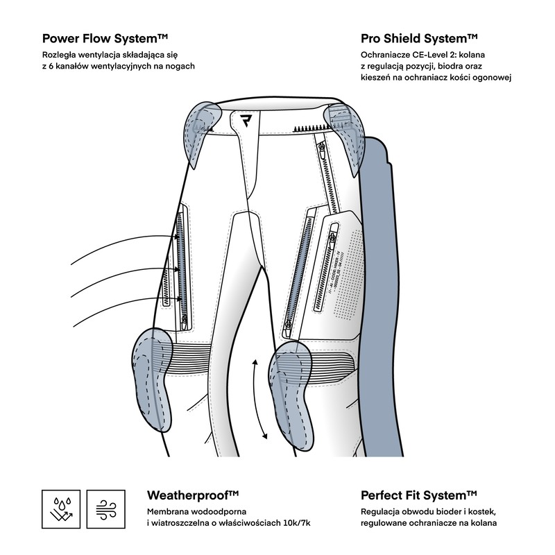 Spodnie posiadają liczne opcje regulacji, aby zapewnić optymalne dopasowanie: